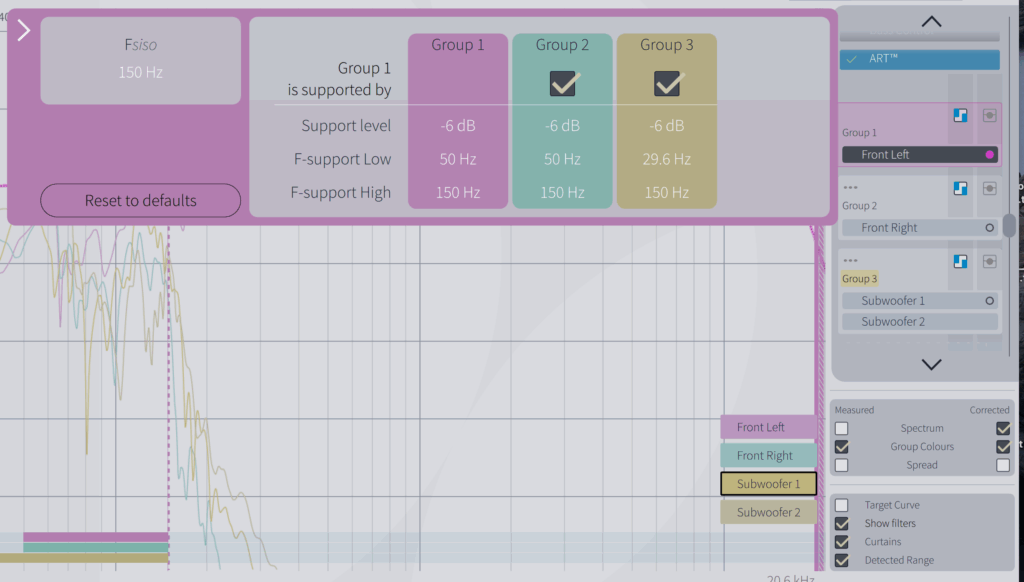 Was sehen wir hier? Die Gruppe enthält nur Front L. In der Konfiguration sind aber noch die weiteren Gruppen 2 (Front R) und Gruppe 3 (beide Subs) enthalten. Alle drei Gruppen in der Konfiguration „für Front L“ haben separate Supporteinstellungen.