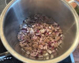 - Zwiebeln und Knoblauch mit anschwitzen (nicht bräunen), dann auch Tomatenmark.